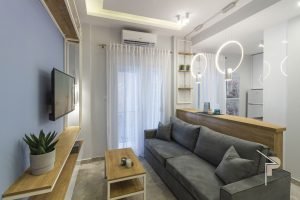 Μπαίνοντας στο διαμέρισμα η σαλοκουζίνα του διαμερίσματος μας υποδέχεται για μία αρμονική περιήγηση. Τα λευκά μέταλλα σε συνδυασμό με τις ανοιχτόχρωμες ξύλινες επιφάνειες τονίζουν το νεανικό ύφος του διαμερίσματος. Ακριβώς πίσω από τον άνετο καναπέ, το πάσο μπαρ, το οποίο μαζί με τα επιβλητικά γεωμετρικά φωτιστικά που αιωρούνται στο κέντρο του, οριοθετούν και ταυτόχρονα ενοποιούν τους χώρους. Η κουζίνα ακολουθόντας την ίδια χρωματική παλέτα φιλοξενεί όλα τα απαραίτητα. Διαθέτει έξυπνους αποθηκευτικούς χώρους, έναν μεγάλο εντοιχισμένο φούρνο με κεραμικές εστίες τεσσάρων θέσεων και ψυγείο με καταψύκτη.μαζί με τους κρυφούς φωτισμούς συνθέτουν. Παραπλεύρως του σαλονιού μια μεγάλη ξύλινη επιφάνεια με μία μεταλλική πολυθρόνα συνθέτουν ένα γραφείο, χώρος εργασίας απαραίτητος πλέον σε κάθε σύγχρονο διαμέρισμα.